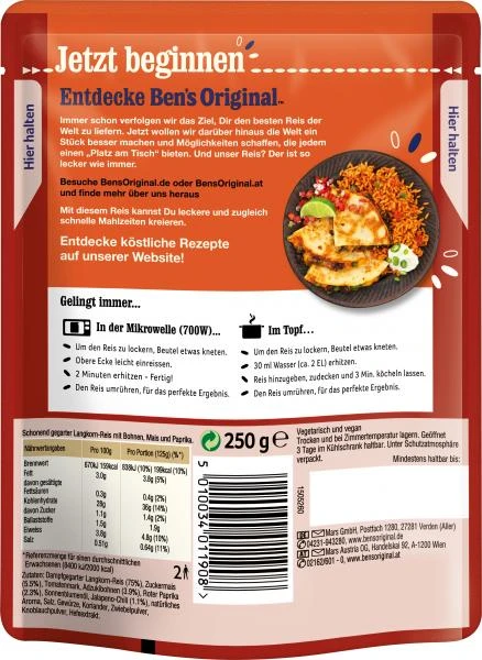 Der köstliche Ben’S Original™ Express Reis mexikanischscharf ist mit sorgfältig ausgewählten Paprika, Chili und Adzukibohnen verfeinert.