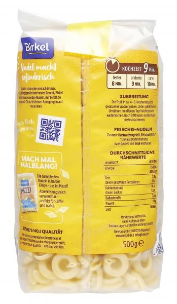 Frischeinudeln aus Hartweizengrieß. Goldgelb mit Biss. Birkel’s No. 1 garantiert alles, was eine gute Frischei-Nudel ausmacht. Sie ist angenehm im Geschmack, kernig im Biss und nimmt die Sauce besonders gut auf.