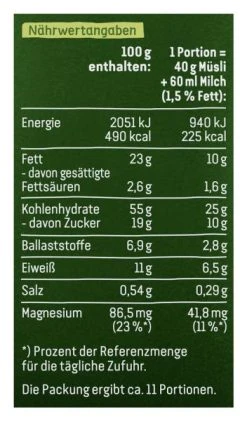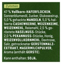 In Vitalis Knusper Plus Müsli Nussmischung verbinden sich goldbraun geröstete Knusper-Crunchies mit Cashewkernen, knackigen Mandeln, gerösteten Haselnüssen und Pekannüssen zu einem besonders nussigen Knuspererlebnis.Ihr Plus an Genuss in Vitalis Knusper Plus Müsli:+ Besonders nussig: mit knackigen Cashewkernen und Mandelstückchen, gerösteten Haselnüssen und Pekannüssen.+ Goldbraune Knusper-Crunchies mit 45% Vollkorn-Haferflocken – dank des speziellen Röstverfahrens besonders knusprig-lecker.+ Reich an hochwertigen Ballaststoffen. Mit Vitamin B1, Eisen, Magnesium.