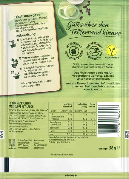 Würziges Hackfleisch, Kartoffeln, Zwiebeln und Lauch, mit Schmelzkäse deftig abgestimmt.