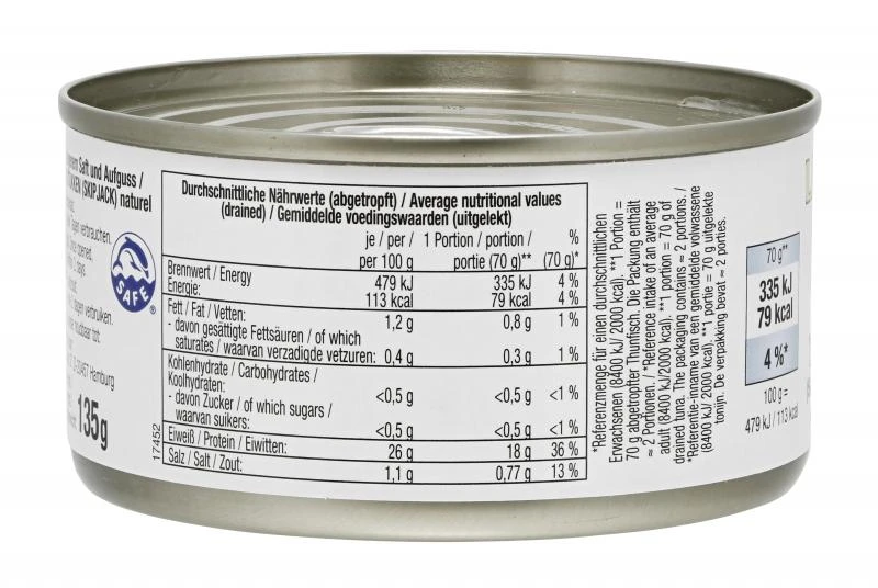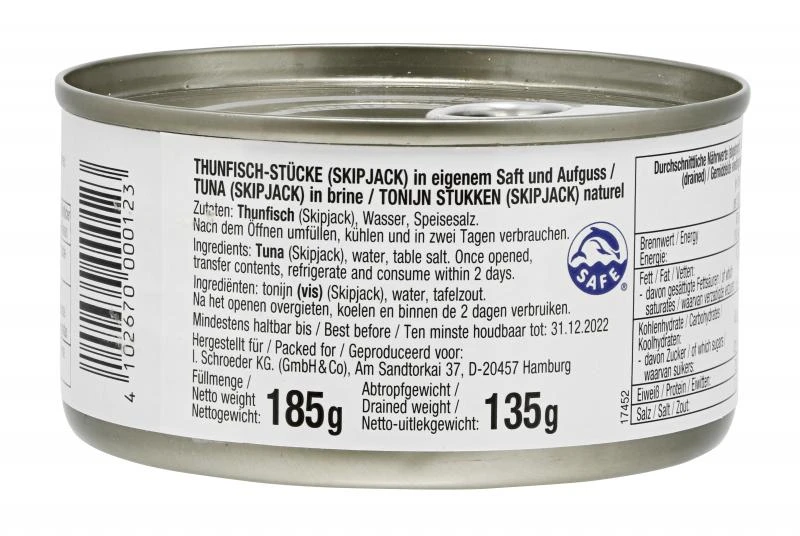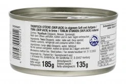 Thunfisch-Stücke in eigenem Saft und Aufguss.
