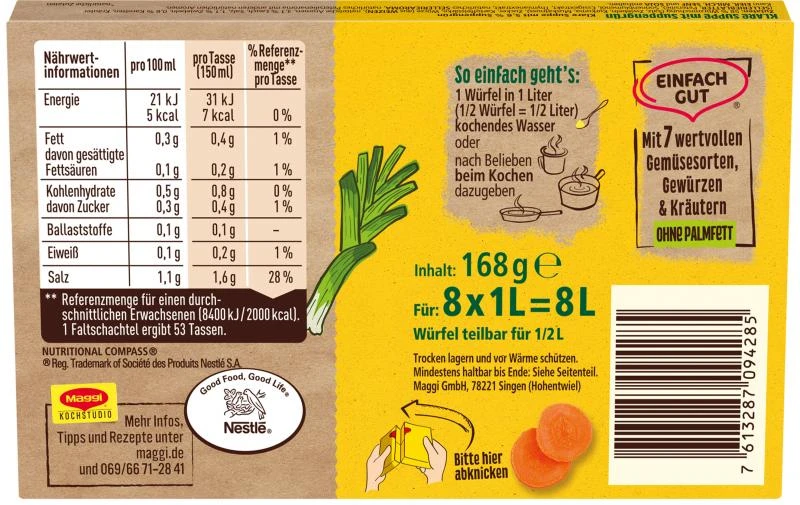 Ein unverzichtbarer und universal einsetzbarer Helfer in der Küche: Maggi Klare Suppe mit Suppengrün. Ob als Suppenbasis oder zum Abschmecken und Würzen zahlreicher Gemüsegerichte durch die klare Gemüsesuppe mit Suppengrün und feinen Kräutern erhalten die Gerichte einen kräftigen, vollen Geschmack. Die praktische Faltschachtel mit 8 Würfeln ermöglicht eine einfache Dosierung und ergibt insgesamt 8 Liter der klaren Suppe mit Suppengrün.
