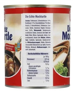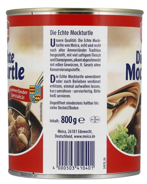 Die Echte Mockturtle von Meica, echt und recht nach alter Ammerländer Tradition hergestellt, mit viel saftigem Fleisch und Champignons, pikant abgeschmeckt mit edlen Gewürzen.