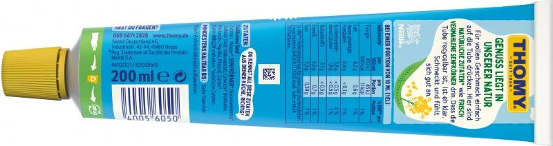 Thomy Mittelscharfer Delikatess-Senf ist einer der beliebtesten Senfarten Deutschlands. Produziert nach dem Thomy Sorgfaltsprinzip: Hochwertige Zutaten, schonende Verarbeitung und größte Sorgfalt bei der Herstellung. Besonders fein vermahlen aus braunen und gelben Senfkörnern der Güteklasse A für den unwiderstehlich cremigen Thomy Geschmack. Natürlich ohne Konservierungsstoffe.
