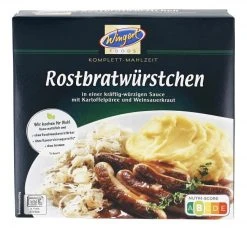 Rostbratwürstchen in einer kräftig-würzigen Sauce mit Kartoffelpüree und Weinsauerkraut.